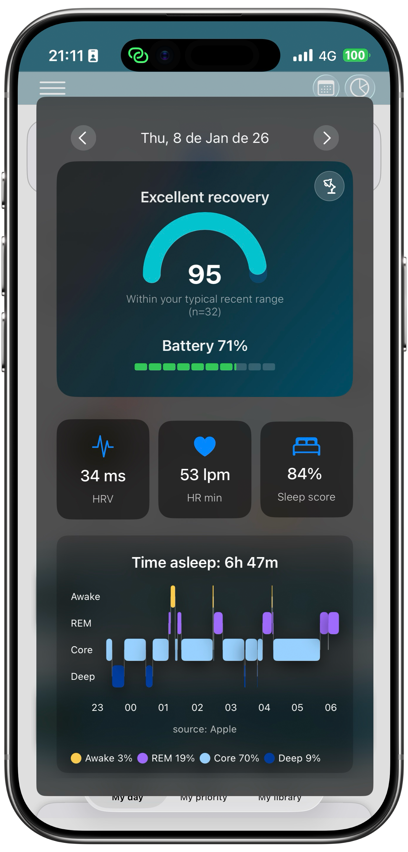 CROSSNote integrates optional health and activity data to provide a clearer picture of the user’s current capacity. This may include information related to sleep quality, recovery, heart rate variability, physical load, and recent activity patterns.