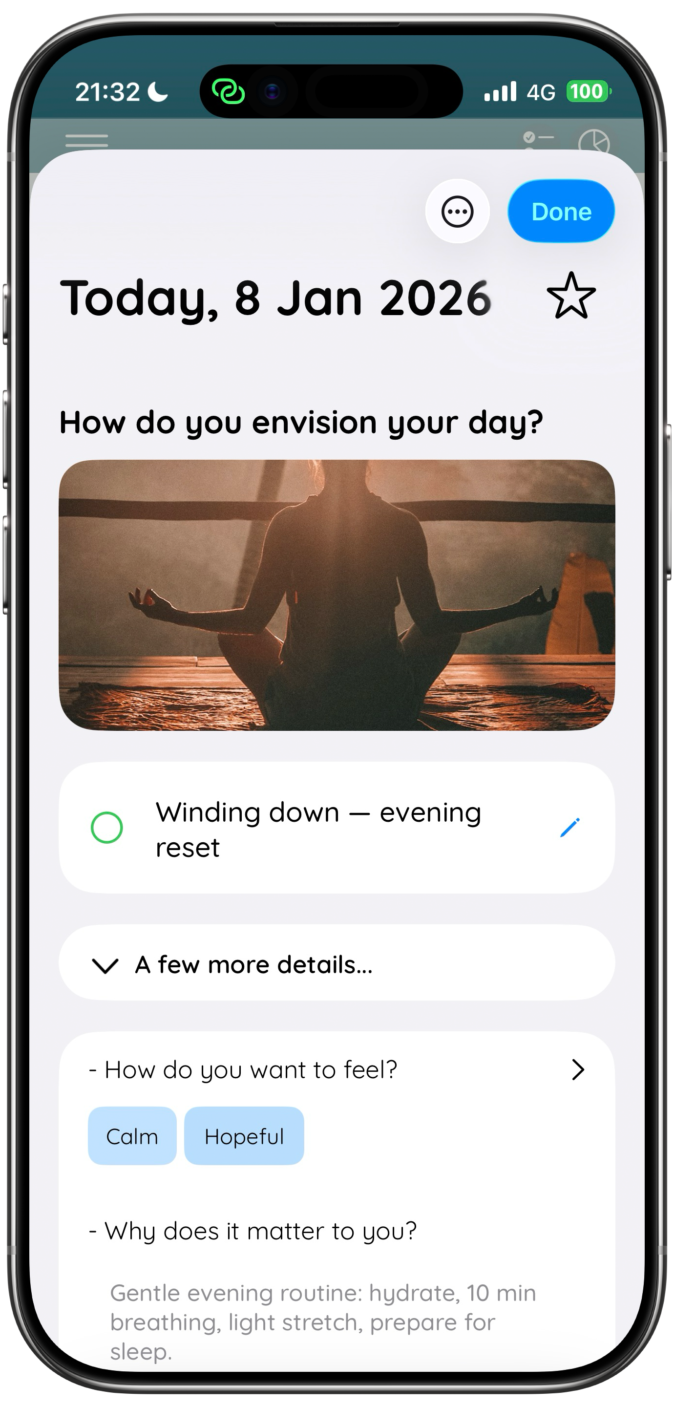 At the beginning of the day, users can set an intention that reflects how they want to approach the day or how they want to feel. At the end of the day, the platform encourages reflection, closing the loop between planning and lived experience.