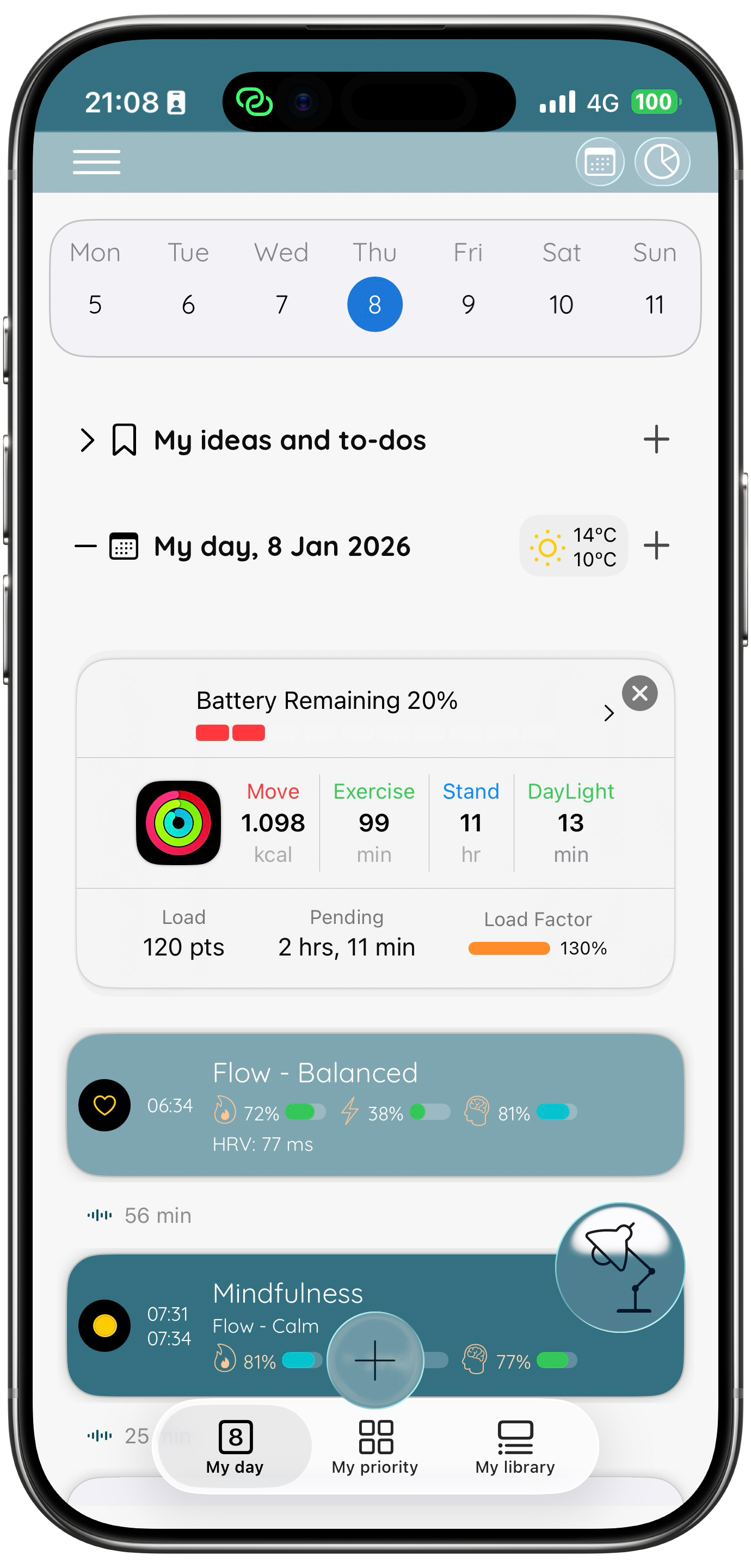 Flow states, focus levels, recovery indicators, and workload context allow the day to be interpreted rather than simply executed. This helps reduce reactive behavior and supports more conscious pacing throughout the day.