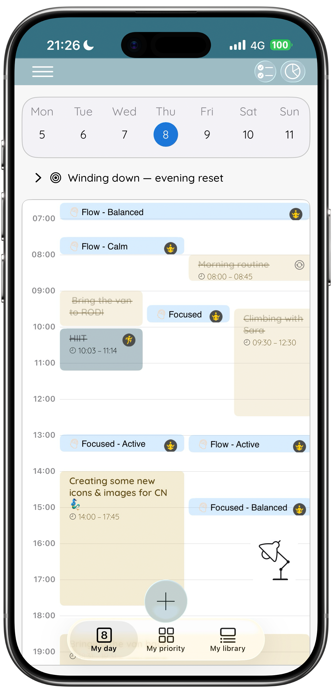 Instead of treating the calendar as a static list of appointments, CROSSNote presents the day as a dynamic system. Events, tasks, trainings, and other activities interact with each other and with the user’s available focus and energy. The platform makes these interactions visible, helping users understand not only what is scheduled, but how demanding the day is and how it feels to live it.